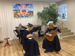 Ярко и профессионально завершил концерт дуэт молодых преподавателей Анастасия Строкина (домра) и Светлана Лущинская (гитара) со знакомой мелодией Я. Френкеля «Журавли» и шуточной, народной «Вдоль по Питерской»