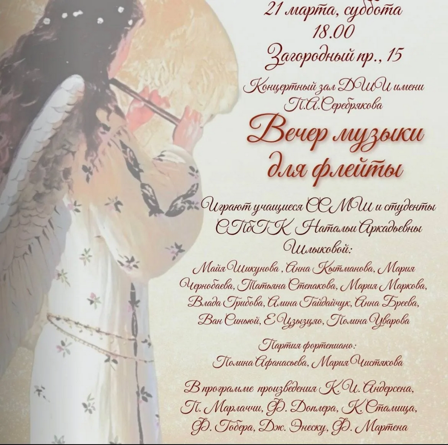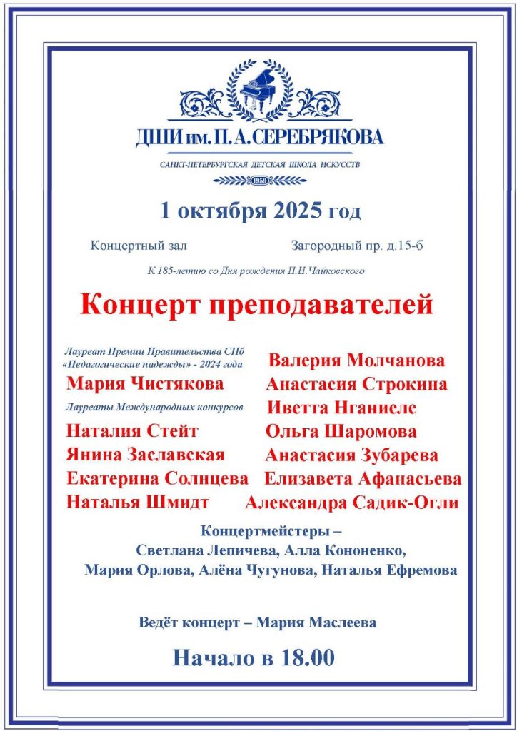 «Музыка не имеет отечества, отечество её вся Вселенная», — писал Фредерик Шопен./ Сегодня, 1 октября, во всем мире отмечается Международный день музыки, в нашей стране — с 1996 года. От всей души поздравляю всех ценителей прекрасного, профессиональных музыкантов (а среди них у меня есть прекрасные друзья!) и просто любителей музыки. Желаю, чтобы в жизни каждого всегда звучали любимые мелодии, которые, несомненно, сделают краше даже самый пасмурный и грустный день. Пусть муза никогда не оставляет без вдохновения творцов, которые будут исполнять для нас и знакомые шедевры и новые произведения! Сегодня по приглашению моей подруги и коллеги Елены Игнатовой я побывала на замечательном Концерте преподавателей Детской школы искусств им. П. А. Серебрякова (Загородный пр., 15-6), приуроченном к празднику. Его вела преподаватель и музыковед Анастасия Киселёва.  Открыла концерт «Фантазия ре минор» — пьеса для фортепиано соло, написанная Вольфгангом Амадеем Моцартом в 1782 году. Это особое произведение, одно из самых оригинальных у великого композитора: оно наполнено очень необычными ритмами. «Фантазию…» блестяще исполнила лауреат международного конкурса Наталия Стейт, нашедшая в моцартовском мире новые красоты и тайны. Творческой радостью пианистка поделилась с нами, слушателями. Далее в